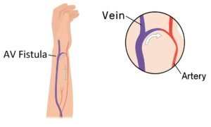 An arteriovenous (AV) fistula is a small surgical connection made between an artery and a vein, usually in the arm, and sometimes in the leg. It allows blood to flow steadily during dialysis.